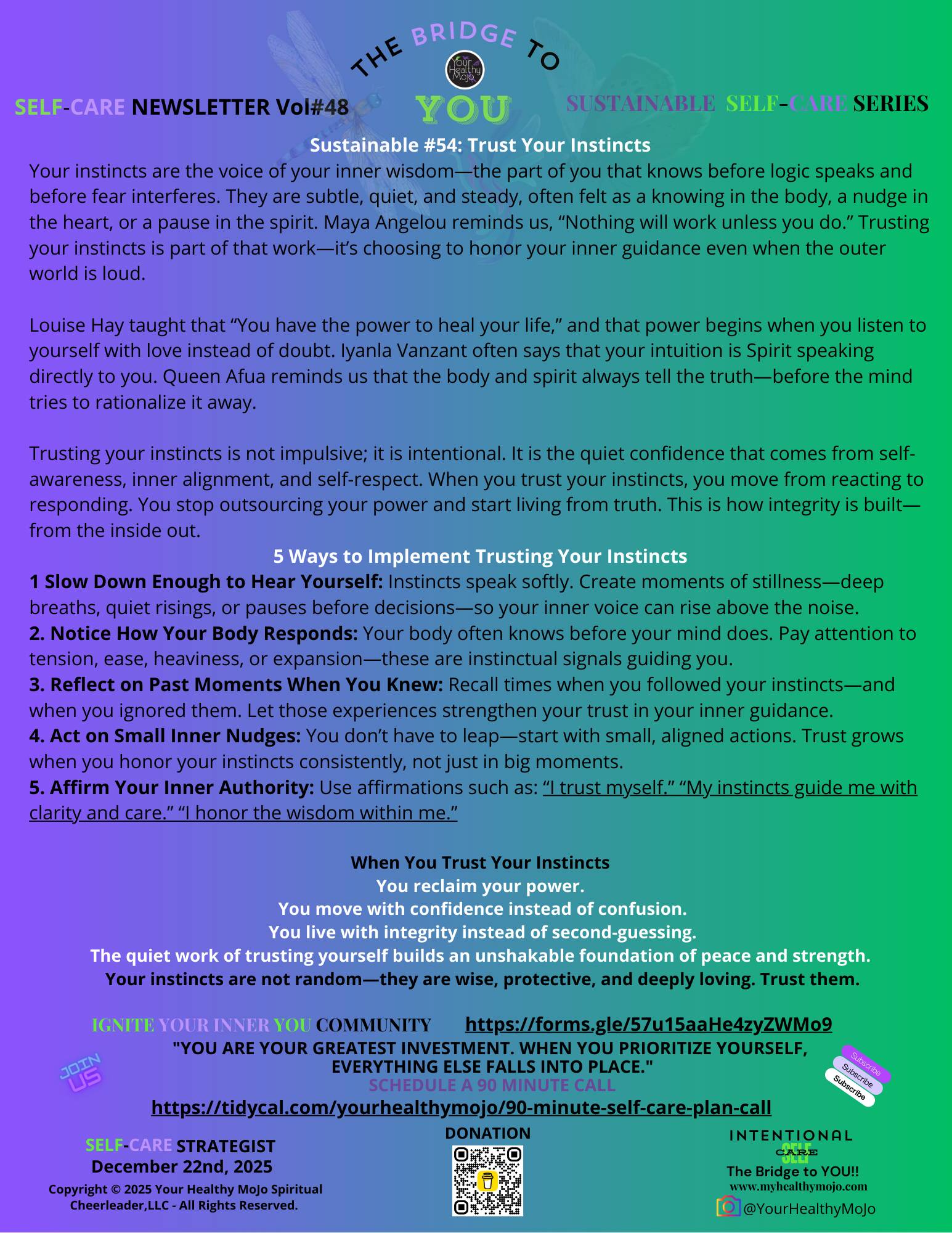 Closing: Heart-to-HeartDearest one, remember that your instincts are not random feelings to be dismissed—they are your body's ancient intelligence speaking, your soul's wisdom guiding, and your protection system functioning exactly as designed. Just as your heart knows to beat and your lungs know to breathe without your conscious instruction, your instincts know what's true for you without needing to explain why. With deep respect for your instinctual wisdom, Your Self-Care Strategist 💕 P.S. Beautiful soul, if you're reading this and struggling to trust your instincts because you've been wrong before, please understand something crucial: what you thought were instincts might have been fear, wishful thinking, or trauma responses. True instinct has a different quality—it's calm, clear, and comes from your body rather than your anxious mind. Start rebuilding trust with small decisions where the stakes are low. "Should I take this route or that one?" "Should I call this friend or wait?" Notice what your body says and follow it. Build the muscle of trust with practice. And remember: even when you've made mistakes, your instincts likely tried to warn you—you just weren't listening yet. Now you're learning. That's beautiful, brave, and exactly right. "The intuitive mind is a sacred gift and the rational mind is a faithful servant. We have created a society that honors the servant and has forgotten the gift." Albert Einstein Join Ignite Your Inner YOU Community where it starts and ends with you BECOMING Intentionally YOU! It's time to start BETTING ON YOU! Pricing Options: