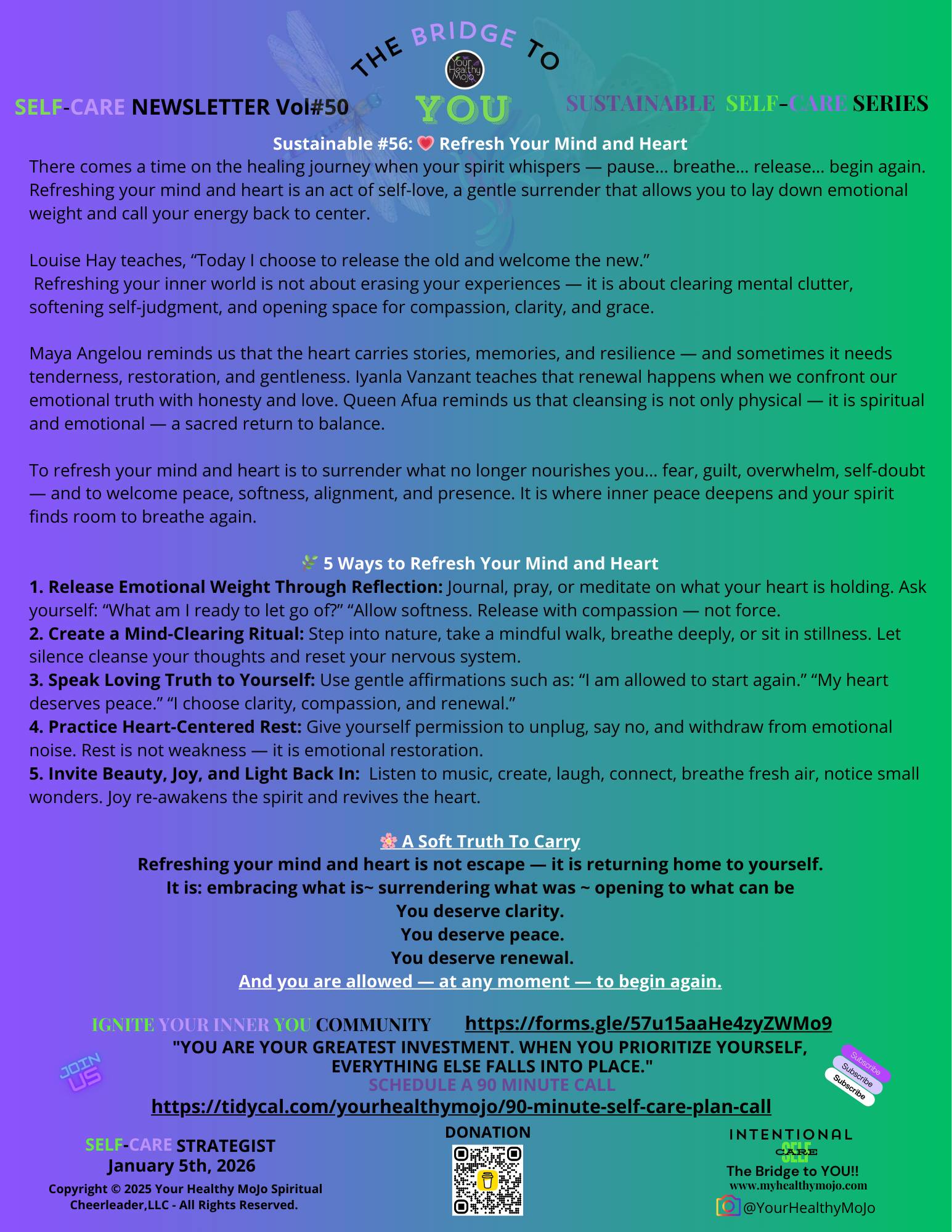P.S. Beautiful soul, if you're reading this feeling overwhelmed by all you're carrying, please breathe gently into your heart. You don't have to release everything at once. Refreshing your mind and heart is a practice, not a one-time purge. Start small—release one worry today. Process one emotion this week. Clear one mental loop. Each small release creates space for the next. And remember: the weight you're carrying isn't proof of your strength—it's often evidence that you've been strong for too long without rest. You're allowed to put it down. You're allowed to feel lighter. You're allowed to refresh and renew as many times as you need. That's not weakness—that's wisdom. Start today with just one small clearing, and notice how even a little spaciousness can help you breathe easier.