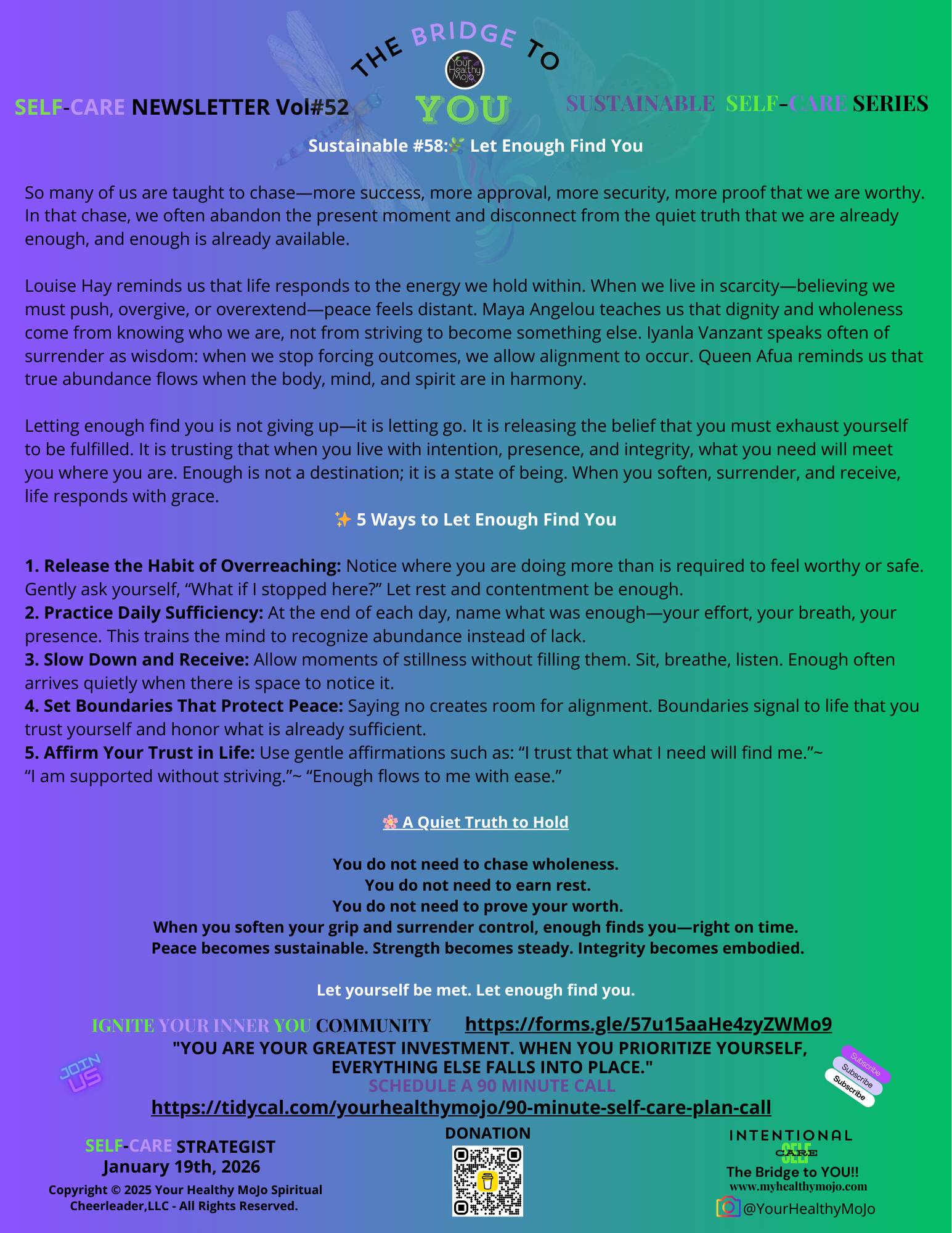 Closing: Heart-to-HeartDearest one, remember that the exhausting chase for enough is optional. You have been running toward something that's been inside you all along. Just as the sun doesn't need to prove its brightness and the ocean doesn't need to earn its depth, you don't need to become anything other than what you already are to be worthy of love, rest, abundance, and joy. With celebration of your complete, whole, sufficient self, Your Self-Care Strategist 💕 P.S. Beautiful soul, if you're reading this and thinking "But I really don't have enough" or "I really haven't done enough," please breathe gently. This message isn't about denying real challenges or legitimate needs. Of course you can want more stability, better health, deeper connections, or greater success. But what if you could pursue those things from a foundation of "I am enough as I pursue growth" instead of "I'll be enough when I achieve this"? The difference is profound. One creates from wholeness; the other creates from lack. Start where you are: find one thing that is enough today. Your breath. Your effort. Your love. Your being. Build from there. Enough isn't about having everything—it's about recognizing the sufficiency of what is while remaining open to what's coming. You are enough to begin. You are enough to continue. You are enough right now. "You have been criticizing yourself for years and it hasn't worked. Try approving of yourself and see what happens." Louise Hay Join Ignite Your Inner YOU Community where it starts and ends with you BECOMING Intentionally YOU! It's time to start BETTING ON YOU! Pricing Options: