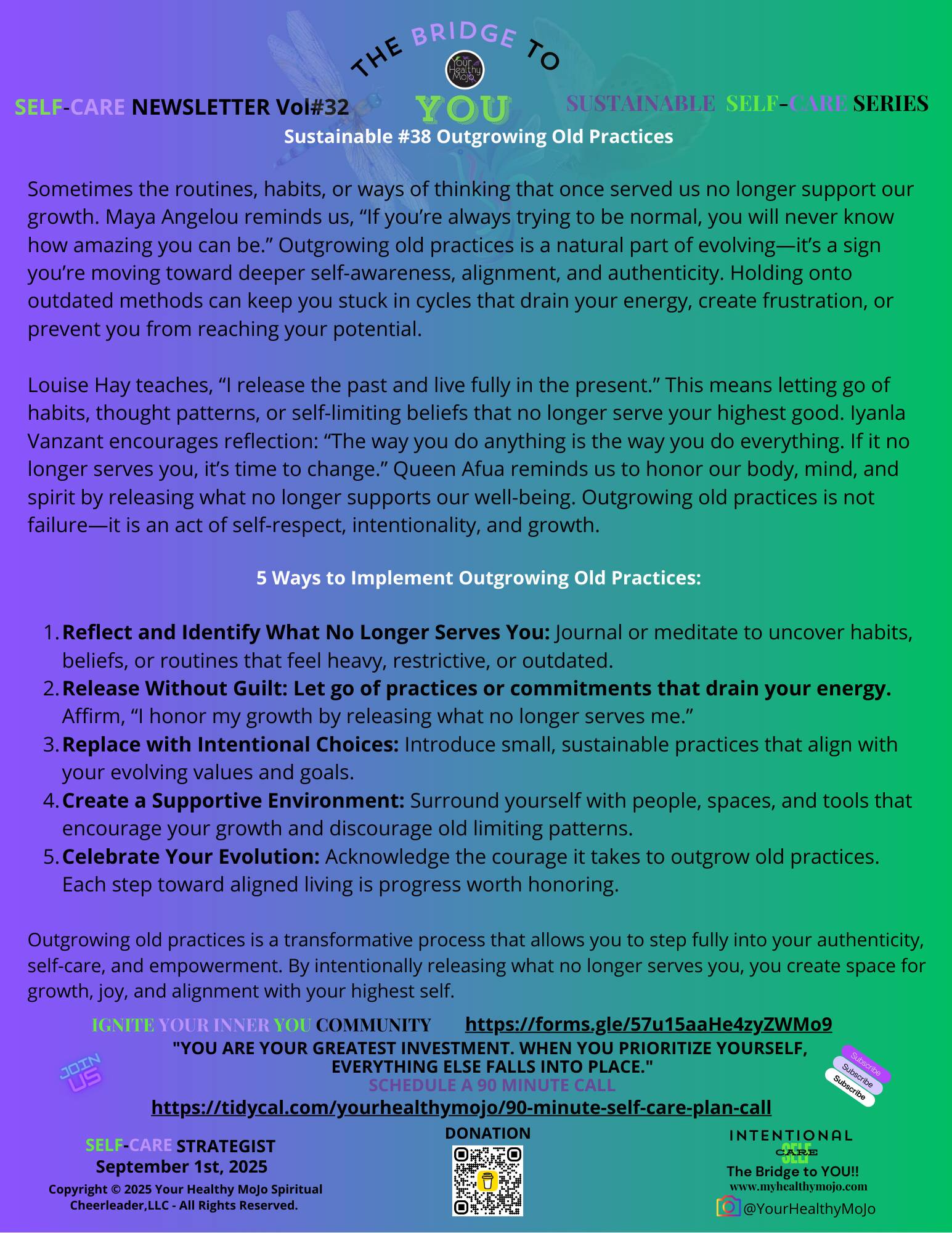 This is your invitation to honor where you are while making conscious space for where you're going. You're not abandoning your past self—you're lovingly updating your life to match the magnificent woman you've become. This week, we celebrate your courage to transform and your wisdom to recognize when it's time to grow beyond what once felt comfortable. You're not just changing habits; you're leveling up into the next phase of your most authentic, empowered self.: Connecting with something bigger than yourself and finding meaning through practices like volunteering, meditation, prayer, or community involvement.