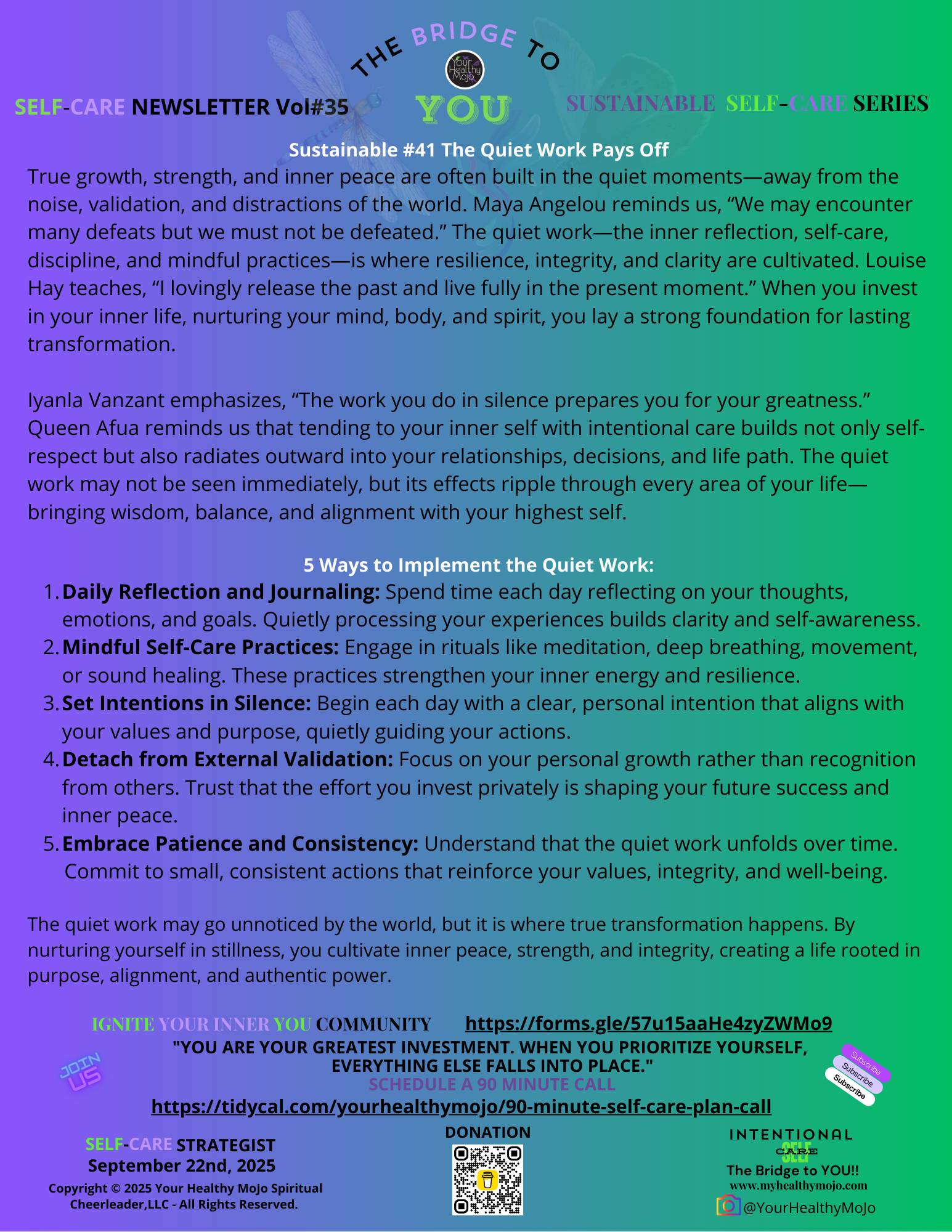 This quiet work paid off in ways I never expected—bringing me honor, inner peace, and moments of pure bliss. I realized that the quiet work is not performed for others; it's the gateway and foundation of our well-being, and we must celebrate that this work happens when no one is watching. The quiet work is the intentional effort we put into our mental, emotional, and spiritual health when it's not required, not applauded, not even noticed. It's the practice of being patient with ourselves, showing up on our toughest days, and doing the hard internal work of healing and growth even when we don't feel like it. It's the foundation upon which all our external success is built—and the most important investment we'll ever make."
