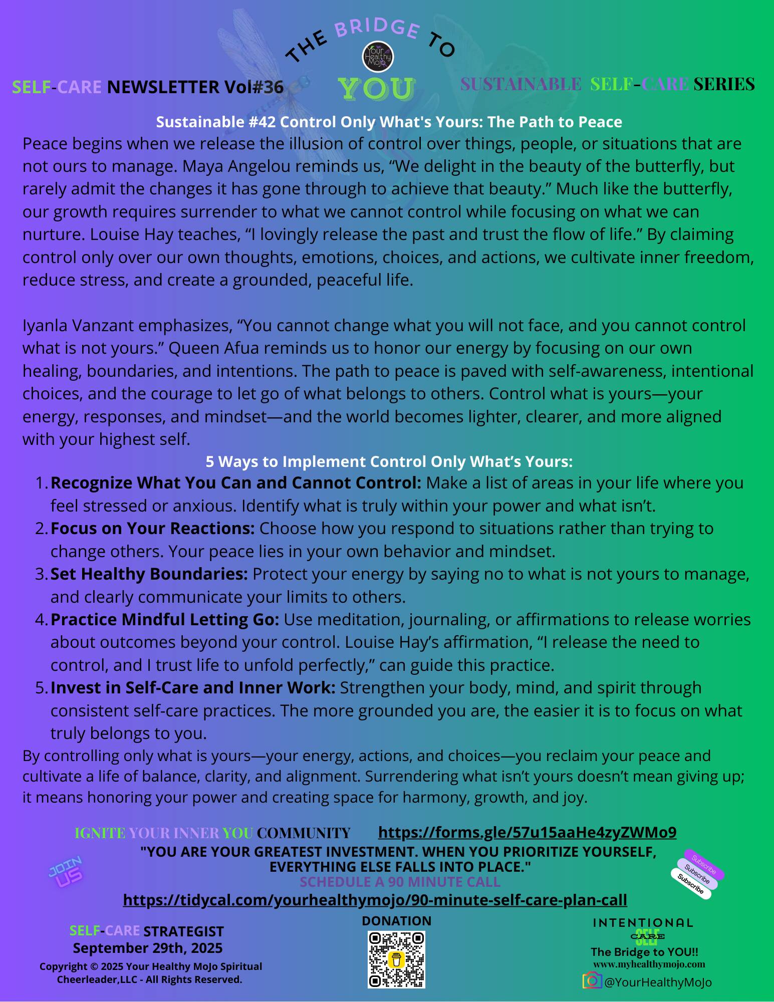 This week, we honor your journey toward divine detachment—not detachment from love or care, but from the exhausting burden of trying to control outcomes beyond your influence. You're not just practicing self-care—you're reclaiming your peace, your energy, and your power by focusing on the one thing you can truly control: yourself.