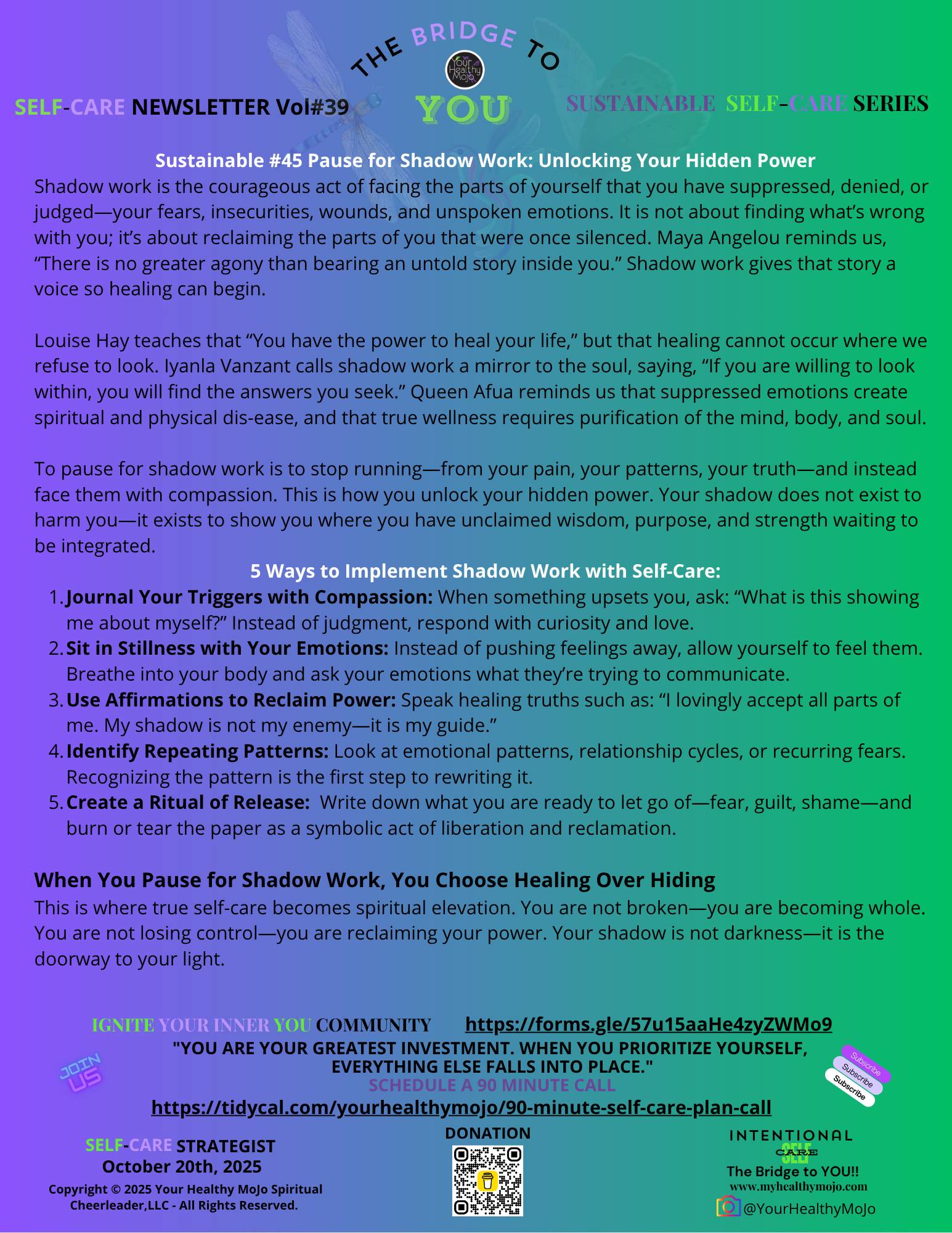 This week, we honor your courage to pause and look within, to meet the parts of yourself you've been running from, and to discover that your shadow holds not your destruction but your liberation. You're not just practicing self-care—you're reclaiming your wholeness and unlocking the power that comes from loving all of who you are.