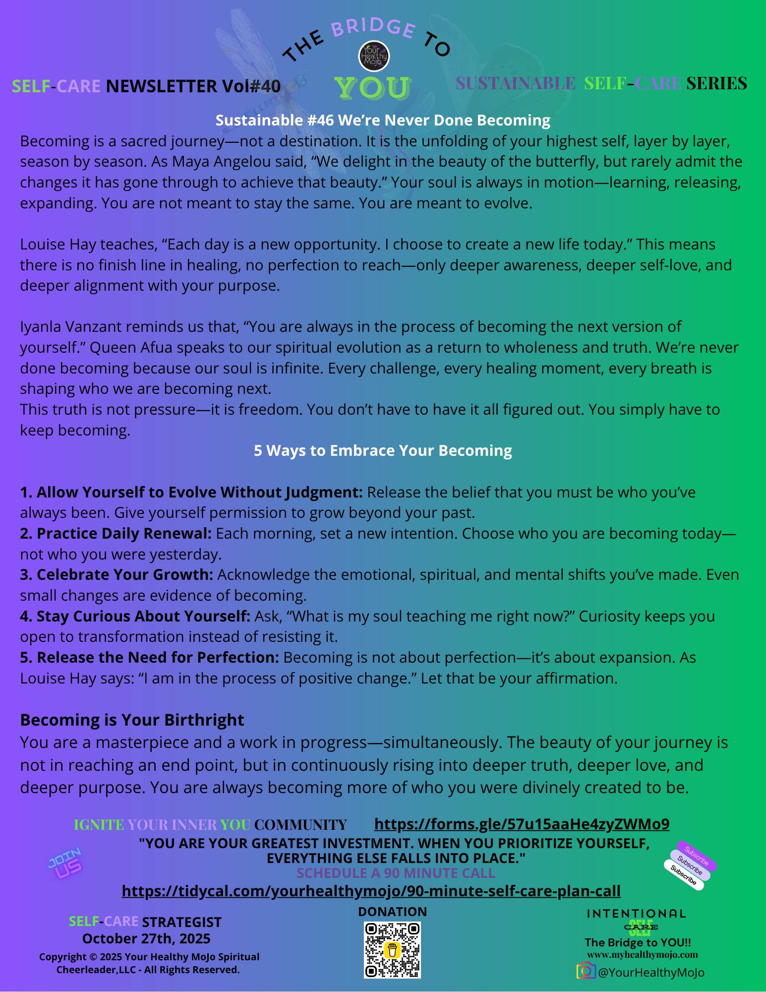 The truth is, life is constantly changing, and therefore, you must constantly change to meet it. Self-care is the practice of gently adapting and nurturing yourself through these endless cycles of becoming. Being "done" is the end of growth. Being "becoming" is the ultimate self-care strategy because it replaces the pressure of perfection with the grace of continuous learning.