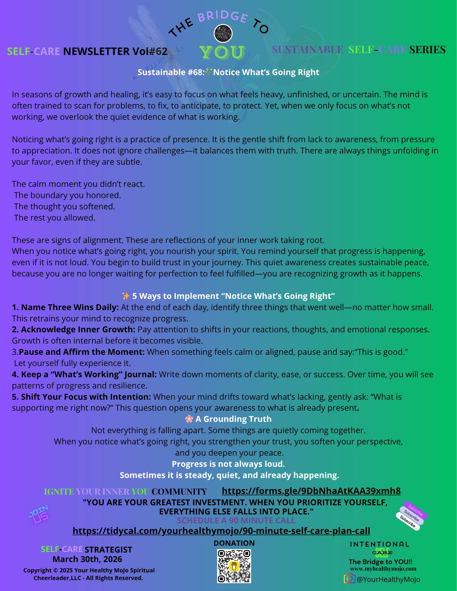 P.S. Sweet soul, if you're reading this thinking "But there really is so much going wrong," I hear you. I'm not asking you to pretend problems don't exist or to bypass real pain and challenges. I'm inviting you to expand your view to include what's also going right. Right now, as you read this, your heart is beating—that's going right. You have access to these words—that's going right. You're still here, still trying, still growing—that's going right. Start there. You don't have to feel grateful for what's hard. You don't have to be positive about what's painful. But you can acknowledge that alongside the difficulty, there's also good. Both can be true. And when you start noticing what's working, you'll find you have more energy and resilience to address what's not. The good doesn't erase the hard, but it does make the hard more bearable. Look for it. It's there.
