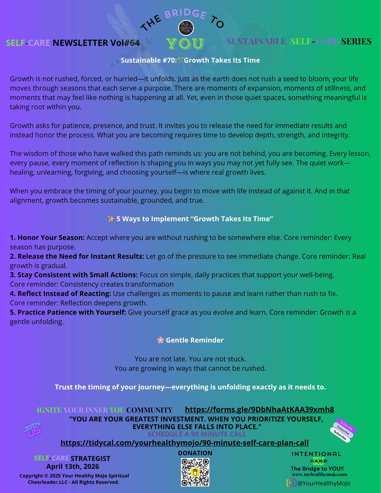 Welcome to this sacred space where we release the pressure for instant transformation and embrace the wisdom of slow, sustainable growth. This week, we're exploring the liberating truth that growth takes its time—that real, lasting change unfolds gradually, that healing cannot be rushed, and that your timeline is exactly right for you. You are not behind; you are becoming exactly as you should.