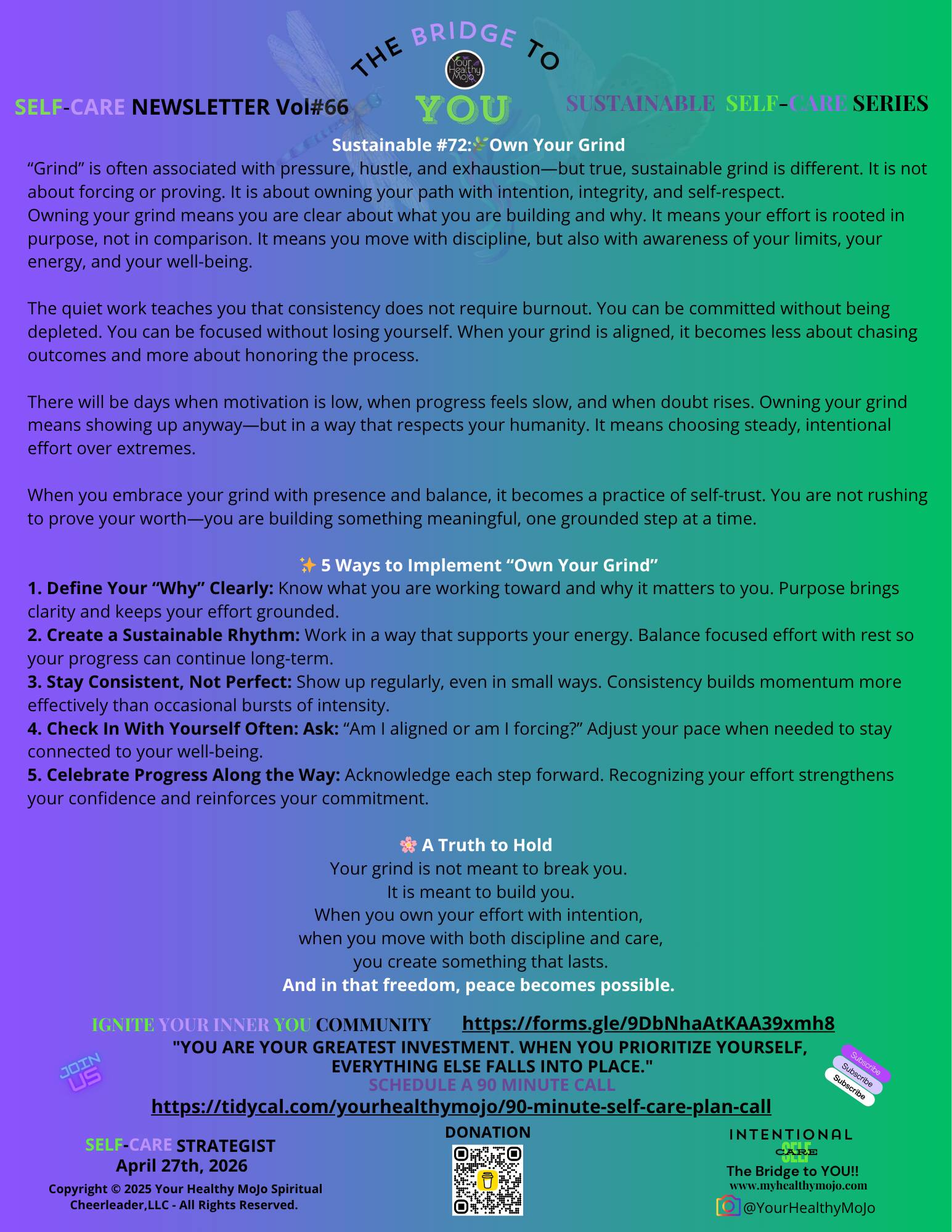 P.S. Sweet soul, if you're reading this feeling confused about whether your hustle is empowering or harmful, ask yourself these questions: Am I working toward something I genuinely want, or trying to prove I'm not lazy? Can I rest without guilt, or does rest feel terrifying? Am I proud of my effort, or exhausted by it? Does my work enhance my life overall, or is it costing me my health and joy? The answers will tell you whether you're owning your grind or being owned by it. If it's the latter, you don't need to abandon effort—you need to redirect it toward goals that actually matter to you and balance it with rest you claim as proudly as you claim your hustle. You can work hard AND rest well. Both are acts of self-love when done consciously. Own your grind, and own your recovery. Both matter.